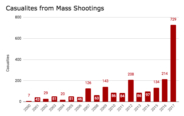 The chart reveals a grim picture. The number of casualties from mass shootings is increasing at an alarming rate with no signs of slowing down. They also know no boundaries. Workplaces, schools, concerts, and churches have all been targets of these mass shooting incidents, and still politicians have not done enough to prevent them. Firearms not safely stored have time and time again been used to commit terrible acts of mass violence at schools.